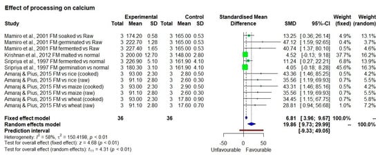 Among the eight studies identified, four studies were rejected as data were incomplete. Of the four eligible studies on calcium in vitro bioavailability, one study was on cooking [31], and three studies [32,33,34] were on other different processing methods such as germination, fermentation and soaking which were used for the meta-analysis. Albeit not shown in forest plot, nine observations from three studies on various methods of processing were included such as soaking, germination, fermentation, decortication, malting, expansion/extrusion/puffing (thermal process to increase size, shape, and volume), and popping. When all 9 observations were analyzed together, there was no significant change in calcium bioavailability as a result of processing (p = 0.15 and 0.38 in the fixed and random effect models, respectively). On the other hand, when the different types of processing methods were analyzed separately, decortication, popping, and extrusion processes led to a decrease in bioavailability of calcium. Five observations on germination, fermentation, and malting showed a significant increase (12.5 to 38.9%) in bioavailable calcium content (p < 0.01) (Figure 3) with low heterogeneity among studies (I2 = 49%) and SMD of 5.18 and 95% confidence interval of 2.19; 8.17 in fixed effect model. These forms of processing are commonly undertaken at the household level in rural Asia, Africa, and in some urban homes in these continents. It is noted that the bioavailable calcium content was high for finger millet compared to other staples (Figure 4).