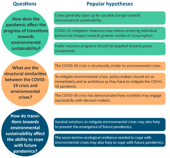 Questions and popular hypotheses regarding the nexus between the COVID-19 pandemic and the transitions towards environmental sustainability that are scrutinized in this study.
