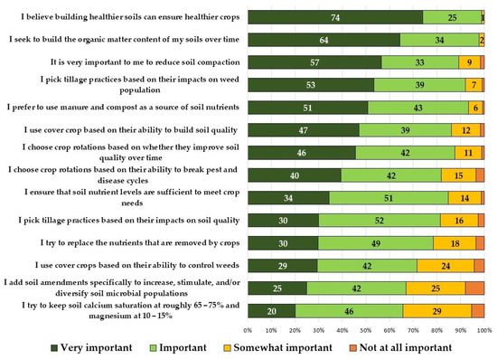 Organic grain farmers indicated that building soil health and organic matter were their most important soil management considerations. This is consistent with previous research that focused on organic vegetable producers [45]. Interest in soil health is also becoming more important to conventional farmers [39]. Previous work has demonstrated that many organic producers have a strong interest in soil health and programs and resources that can help them assess how different soil amendments, crop rotations, and tillage practices interact to impact soil health and agronomic outcomes would likely be welcomed [26,45]. At the same time, soil management decisions by organic farmers reflect more than just a focus on soil health. For example, their decisions about tillage are driven more by a desire to control weeds than by impacts on soil quality. Similarly, the choice of crop rotations reflects a mix of goals—including improving soil quality but also breaking pest and disease cycles.