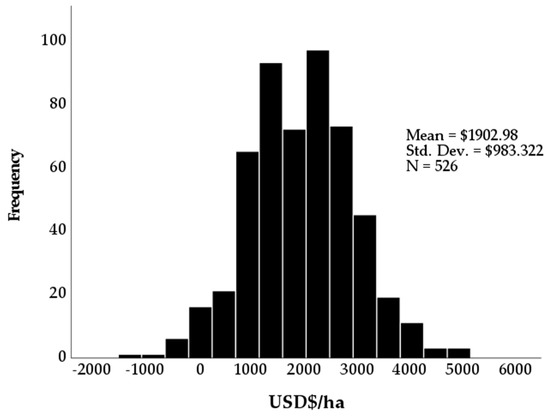 When total costs are balanced against revenues from corn grain, our findings indicate that organic farmers in this region received average net returns to labor and management of $1903 per hectare (median = $1928) in 2017 (Table 6). Net returns varied widely by farm but were distributed normally (Kolmogorov–Smirnov test p = 0.200; Shapiro–Wilk p = 0.830), ranging from a net loss of −$1257 to a net gain of $5090 per hectare (Figure 3). Excluding the top and bottom 10 percent of producers, the vast majority of farmers received a net return between $709 and $3154 per hectare.