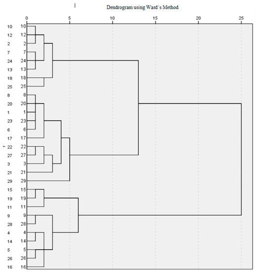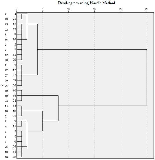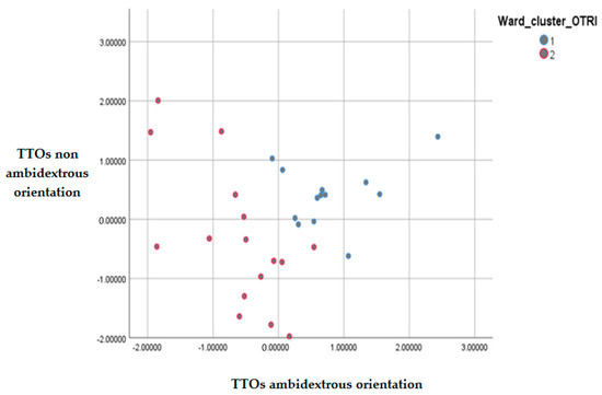 When applying the cluster analysis, Ward’s method and the Square Euclidean distance were used. These techniques were frequently used in these studies [102] as they allowed for maximum homogenisation of the clusters. First, it was analysed whether there were two different groups of TTOs, depending on their ambidextrous orientation. As can be seen in the dendogram (Figure 1), two main clusters were identified, one composed of 13 ambidextrous TTOs, and the other containing 16 non-ambidextrous TTOs. Table 2 shows the composition of each of the clusters.