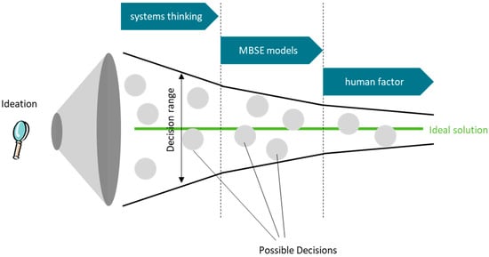 The SMH process has been developed to help decision makers narrow the decision range down closer to the ideal solution. The acronym stands for systems thinking (S), model-based systems engineering (M), and human factor (H). This approach defines certain steps and is described on a theoretical basis, and does not represent a programmed decision support system. This differentiation is discussed in Section 7, where steps towards a practical implementation are described also. Figure 1 shows the steps of the SMH approach and how they influence the range of possible decisions, which is illustrated in this figure in form of a cone. The cone of possible decisions visualizes that certain steps, which have to be executed along the decision making process, narrow the range of possible decisions (which means that not ideal decisions are excluded from the process) and approach the ideal solution. This approach was invented at the Graz University of Technology and focuses on the application of complex system decisions. The aim is not to provide a process which emphasizes every psychological detail of a decision, but to combine technical support systems and basic psychological decision theories for practical applications.