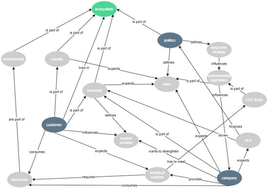 Systems thinking is applied in this approach by describing the network of aspects, which are relevant in the given case. Figure 2 shows this semantic network, which can be seen as some form of ontology model. A semantic network basically consists of nodes (objects) and links (relations) between them [], which are directed and labelled in the illustrated case. This is just one approach how a complex decision situation, consisting of stakeholders (e.g., customers, politics) and other aspects (e.g., resources, CO2 limits), can be modelled. The motivation behind this first step of the SMH approach is to reduce uncertainty by carefully analyzing the ecosystem, the situation of the company, politics, economics, to name a few aspects.