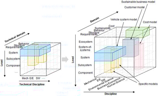 - Domain: In technical developments, the main focus is to model the requirements, the structure and the behavior of a system, its subsystems, and components. When considering the ecosystem, the cost aspects (which are not limited to production cost, but which can also reflect resulting costs due to environmental impact) and sustainability have to be added.