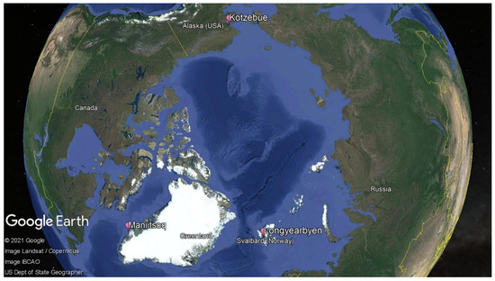 The locations of the communities for the case study: Longyearbyen, Maniitsoq, and Kotzebue. Source: Google Earth US Dept of State Geographer Image Landsat/Copernicus NOAA, US Navy, NGA, GEBCO.