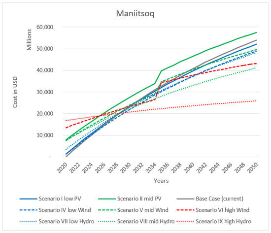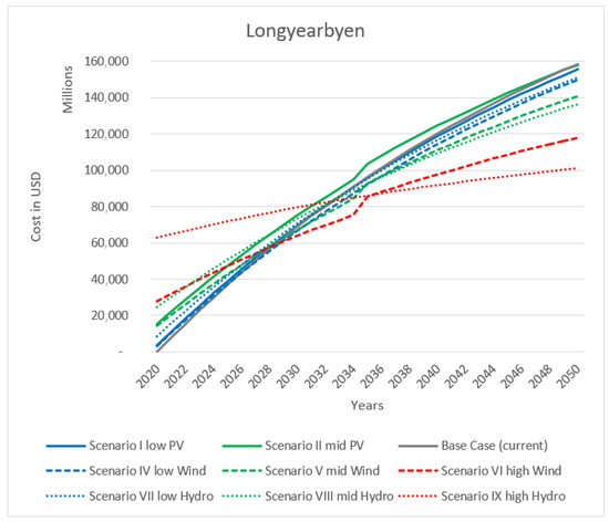 Figure 4 shows that the different renewable energy scenarios have a positive net benefit compared to the current system owing to reduced operation costs over the represented 30-year time horizon. The break-even point can be reached after five years, depending on the various scenarios. The shortest time to reach break-even point—five years—is in scenario IV low wind. Scenario II mid PV does not reach break-even point within the given time frame owing to the exchange of the battery unit. Regarding the wind scenarios, it is interesting that the operation of low and medium penetration has approximately the same cost-saving effect over the simulated time. This is due to the replacement of the battery stack in the medium-penetration scenario. The ‘low PV’ and ‘low wind’ cases offer significant cost-saving benefits for little investment, making them suitable options when available funding for large-scale solutions is limited. The ‘low hydro’ and ‘mid wind’ cases have high investment costs with cost savings on par with the above-mentioned ‘low PV’ and ‘low wind’ cases. The ‘high wind’ case offers good cost-saving benefits, but the following two options are more financially feasible. The ‘mid hydro’ and ‘high hydro’ cases have high investment costs, but their cost savings over time are favorable relative to the investment cost. Both cases present cost data in favor of more significant investments in renewables.