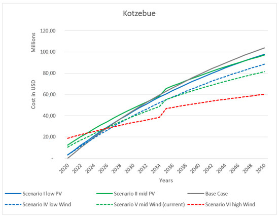 Scenario analysis of possible power generation for Kotzebue shows the accumulated net present value of the cost for power generation with a diesel price of 0.91$/L; capacity factor of 17%; and fuel consumption of 0.28 L/kWh. The other input data are explained in Table 1, and the scenarios are presented in Table 2. The current setup is close to scenario V; Kotzebue has 18% renewables in the mix.