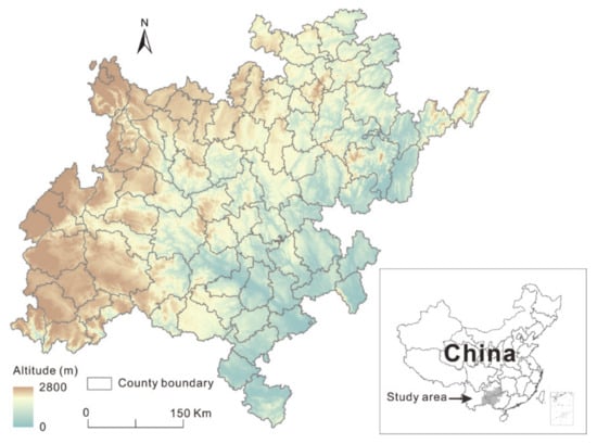 The Dian-Gui-Qian contiguous extremely poor area is located in southwest China (Figure 1). It covers a total area of 227,544 km2 and has a permanent population of 29.15 million. There are 91 county-level administrative districts in this region, including six municipal districts, five county-level cities, 66 counties, and 14 minority autonomous counties. In China, administrative districts are divided into four levels: provincial (municipality, province, autonomous region, and special administrative region), prefectural (prefecture-level city, autonomous prefecture, prefecture, and league), county (district, county-level city, county, autonomous county, banner, autonomous banner, special district, forest district), and township (subdistrict, town, township, ethnic township, sum, ethnic sum, and county-controlled district).