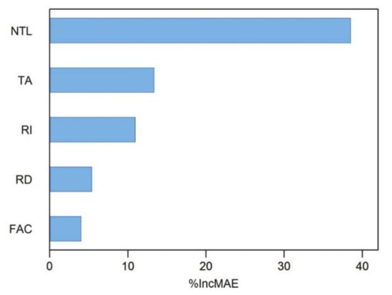 Figure 5 shows the influence of the five variables on the XGBoost model. NTL had the highest importance (% IncMAE = 38.51%), indicating that NTL was the most important variable for capturing the spatial variance in poverty. NTL can effectively reflect the intensity of human activities and is closely related to the social economy, thus resulting in a very high importance index. The importance of TA (% IncMAE = 13.33%) was secondary to that of NTL, suggesting that the connection to cities in the study area restricted the economic development to a great extent. RI also had a high importance (% IncMAE = 10.03%), indicating that natural disasters in this region were also an important factor restricting residential poverty levels. The % IncRMSE values of RD and FAC were 5.38% and 4.01%, respectively, indicating that local traffic and terrain conditions had a certain influence on the level of poverty, but such influence was less than that of the other three variables.