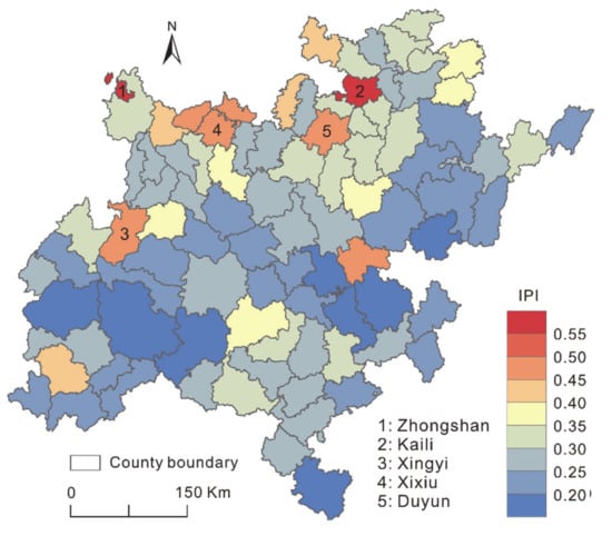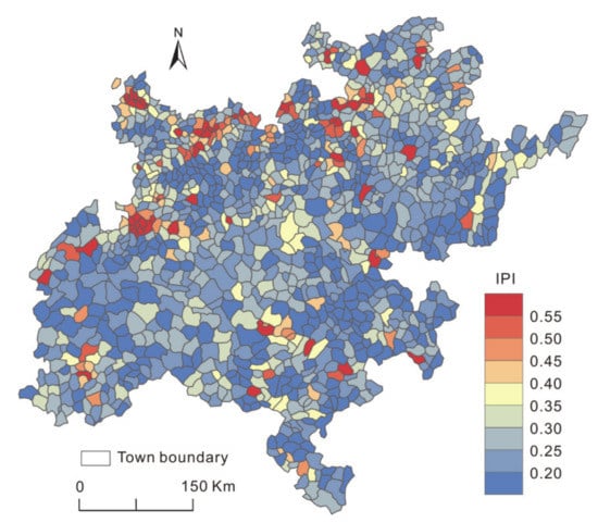 The calculated weights of the indicators are shown in Table 1. Then, the IPI of each county-level administrative district was calculated as follows: