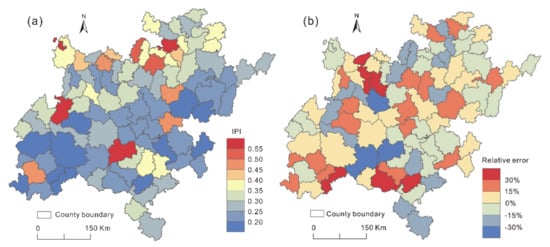 Spatial distribution of the actual county-level IPI (a) and relative error (b) in the Dian-Gui-Qian contiguous poor area.