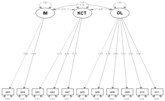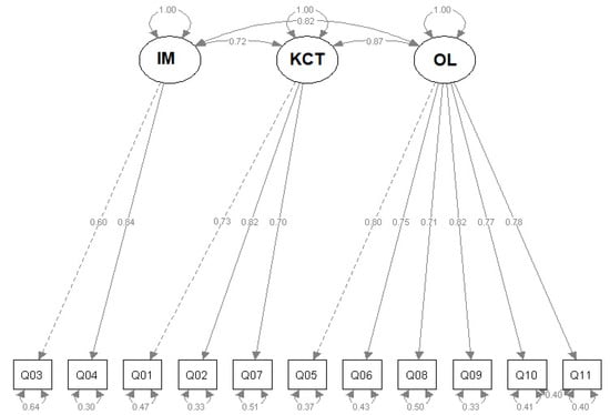According to the results obtained in the principal component analysis, the proposed model is composed of 11 observed variables, grouped into 3 latent variables: IM, with two questions; KCT, with three questions; and OL, with six questions (see Table 10).