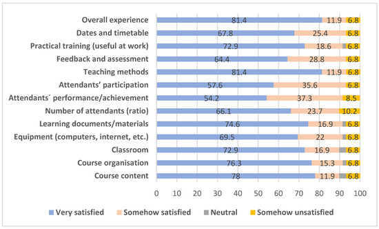 The degree of satisfaction shown by 44 teacher educators who answered the questionnaire [34] is also very high (see Figure 2). The whole experience and the methodology were the most valued, with more than 80% of participants being very satisfied. Next, with satisfaction percentages above 70%, were items related to the organisation of the course, its content, the academic materials used, the practical training and the classrooms. Finally, some items related to the performance of the participants and their participation received lower ratings.