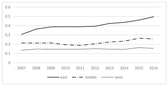Using the data in Table 2, the level of FDI of each province in China from 2007 to 2016 can be calculated. Figure 2 shows the comprehensive level of annual average FDI by region from 2007 to 2016. First, the overall level of foreign investment in China shows an increasing trend year by year, with the most obvious increase in the east, and more fluctuation in the middle and west. Secondly, the comprehensive level of FDI varies greatly among regions. The specific manifestation is that the eastern, central and western areas gradually decrease, and the FDI level in the east is significantly higher than that in the middle and west. The above phenomenon indicates that different regions in China still have a lot of room for improvement in the introduction of high-quality FDI.