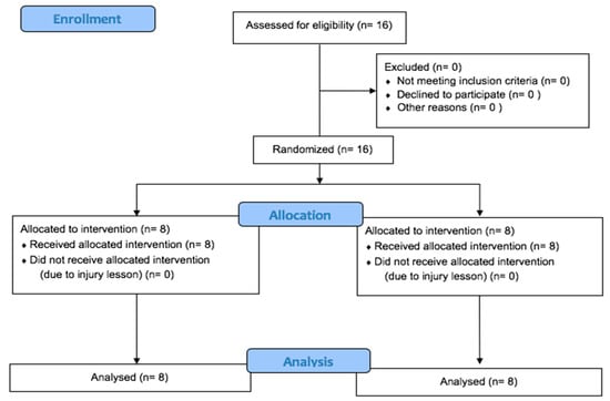 The distribution of the variables was examined using the Shapiro–Wilk test. The data are presented in mean and standard deviation. For the differences, the 95% confidence interval and the percentage of change are presented. Sphericity was tested and confirmed using the Mauchly test. A two-way (group, two levels; moment, two levels) analysis of variance with repeated measurements in the second factor was used. In addition, the Bonferroni test was applied as post hoc. The Mann–Whitney test was used to compare the differences between groups in the percentage of change. As a measure of the effect size (ES) of ANOVA, partial eta squared (n2p) was used; additionally, Cohen’s d was calculated following the classification proposed by Rhea for recreationally trained participants (individuals training consistently for 1–5 years) (trivial < 0.25; small 0.25–0.50; moderate 0.50–1.0; large > 1.0) [26]. A change beyond twice the TE was representative of a high probability (i.e., 12 to 1 probabilities) of the observed response outside of a true physiological adaptation beyond what might be expected as a result of technical or biological variability. Therefore, the TE was as follows: fat %, 0.51 (%) × 2; body mass, 1.54 (kg) × 2; VO2max, 1.91 (mL/kg/min) × 2; CMJ, 2.57 (cm) × 2; CMJ-left, 1.42 (cm) × 2; CMJ-right, 2.47 (cm) × 2; actions, 18.62 (rep); time, 32.90 (s); and punches, 52.17 (punches). In addition, the Fisher’s exact test was used for comparisons between groups of subjects who were at the 2 × TE calculated on each outcome (NR) or more than twice the TE (responders (Rs)) [22].