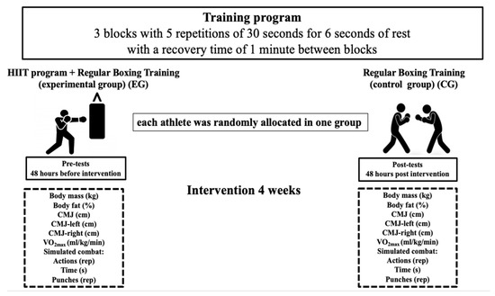 The HIIT protocol consisted of punching the bag with speed and force, with free combinations, the work was divided into 3 blocks with 5 repetitions of 30 s for 6 s of rest, with a recovery time of 1 min between blocks, and the protocol was applied 3 times a week for 4 weeks. The experimental HIIT protocol was conducted 10 min after the boxing training session.