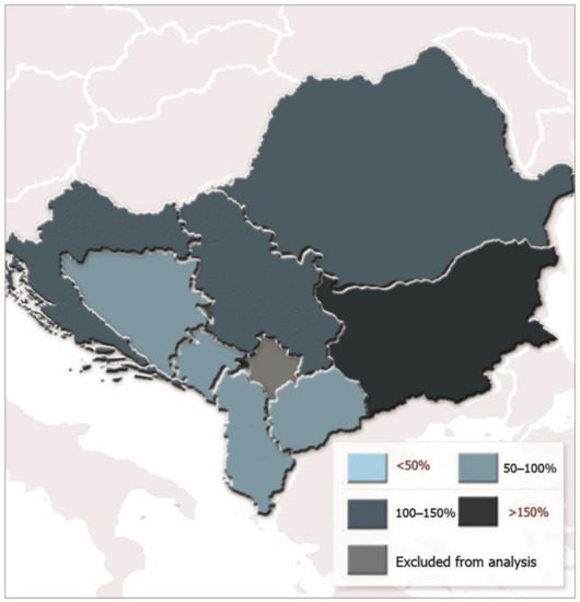 Out of eight countries in our sample, there were four countries (Bulgaria, Croatia, Romania, and Serbia) that showed overall SSRfood above 100%, while four countries (Albania, Bosnia and Herzegovina, North Macedonia, and Montenegro) showed an SSRfood below the line of 100% (Figure 1).