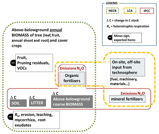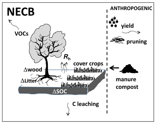 where the LTC represents the lateral transport of carbon related to anthropogenic imports/exports such as fruit harvest, removing of pruning residuals and import of organic fertilizers. A schematic of the NECB is proposed in Figure 3.