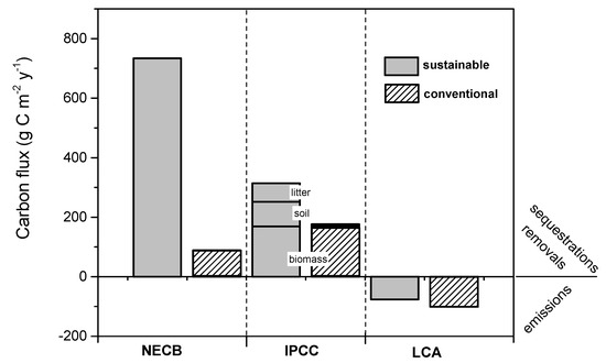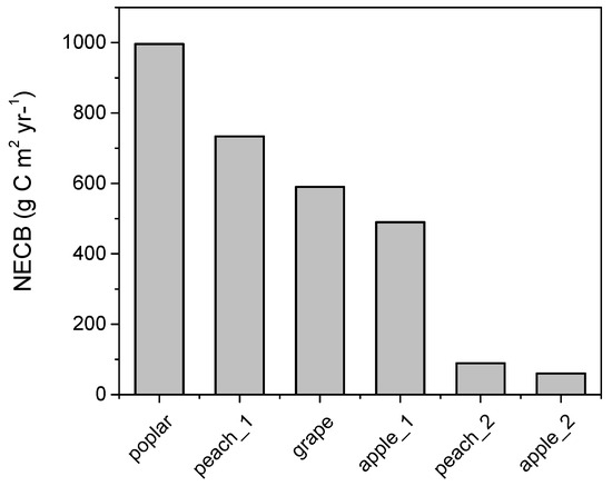 The NECB framework has been implemented in various tree crops resulting in net sink (NECB > 0) (Figure 4). Values of NECB within tree crops are greatly variable and, in some cases, it could be vulnerable and easily fall in the negative territory, becoming a source (see peach_2 and apple_2 in Figure 4) just in case of increased C export due, for example, to an increased yield [49]. Upon the application of a set of sustainable practices (compost supply, recycling of pruning residuals, cover crops), C budget values might increase up to approx. 750 g C m−2 yr−1 and be in the magnitude of that reported for a forestry species under woody ash and nitrogen application (see peah_1 and poplar in Figure 4). The NECB framework simultaneously captures C fluxes related to human activity and to the biome photosynthesis (NPP) and soil respiration (Rh). However additional C fluxes (e.g., leaching, volatile organic compounds, CH4, CO, CO2 emissions from fire) might be accounted within the NECB framework [48].