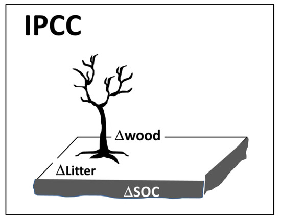Illustration of the three pools at cultivated field whose C stock variations are accounted within the IPCC procedures [31]. SOC = soil organic carbon, wood = coarse above- and belowground wood. Note that these three pools are also included in the NECB framework (see Figure 3).