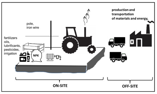 Schematic representation of typical inputs provided by the technosphere to the agrifood production used at field (on-site) or off-site. Note that the GHGs associated to these inputs are accounted within the life cycle assessment (LCA) framework.