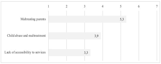The values of all factors were evaluated. “Maltreating parents” were identified as the most concerning factor observed by child welfare professionals frequently in their practice, and “Lack of accessibility to services” was the factor least observed by the respondents (Figure 1).
