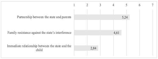 The State–Parent Relationship is one of the significant dimensions in the analysis of Gilbert et al. [2]. In this research, three factors were extracted from the State–Parent Relationship scale that were interpreted and named as the following factors: “Partnership between the state and parents” (Factor 1), “Family resistance against the state’s interference” (Factor 2), and “Immediate relationship between the state and the child” (Factor 3). To note, Factors 2 and 3 are one-item factors (Table 8).
