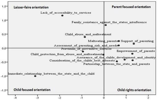 The following four vectors, in the present paper referred to as child welfare orientations, were identified in Lithuania (Figure 5): “Parent-focused orientation” group factors that reflect parents-related issues; “Child rights orientation” group factors that reflect the UN CRC provisions; “Laissez-faire orientation”; and “Child-focused orientation”. Each of these orientations is based on far-distant and single factors, with the first orientation reflecting the lack of accessibility to services and the second one reflecting the immediate relationship between the state and the child. It is assumed that all four vectors of the multidimensional model, which can be named as orientations, display the configuration of the child welfare system in Lithuania.