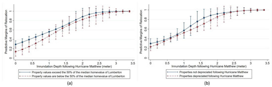 Examining the predictive margins for the probability of relocation sheds light on how homeowners with financial constraints face significant challenges in mobility decisions. Figure 2 exhibits predictive margins for the probability of relocation over inundation depth based on the ratio of the property value to the city’s median property value and depreciation in property value. Controlling for all other explanatory variables, Figure 2a indicates that regardless of the severity of inundation risks, homeowners whose property values are below the median property value of Lumberton are less likely to relocate. Similarly, homeowners whose properties depreciated following Hurricane Matthew are less likely to relocate than those whose properties did not depreciate in the overall range of inundation risk (see Figure 2b).