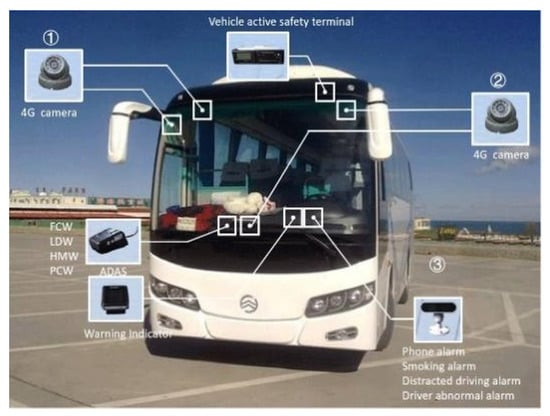 The driving data utilized in this study were from the intelligent data platform of bus in the Jiangsu province, which was set up by the Jiangsu provincial government. Most commercial vehicles in Jiangsu have installed ADAS, including various warning functions. The intelligent data platform collects naturalistic driving and warning data from these buses. All drivers in the platform have been informed and agreed in advance that their driving information (videos, GPS, driving characteristics, etc.) and personal information (gender, age, identity card information, and driving license information) will be collected and used for relevant research purposes. In this study, 20 buses were selected and all of them were using the Mobileye M630 system, which is a mature system and has been used in many other studies [37]. The equipment applied in the buses involved is illustrated in Figure 2.