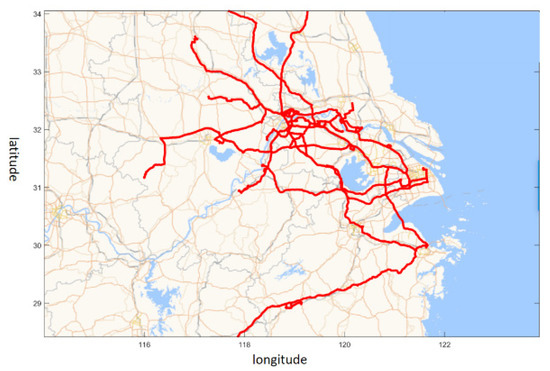 To study the characteristics of the drivers’ responses to ADAS in different road environments, the road environment needs to be assessed for each alarm. The driving course information of the 20 drivers captured by the GPS is depicted in Figure 3. The GPS data were processed with Map API of AutoNavi and the road types for each alarm position were obtained. The road types were classified into the following three categories: freeways, urban roads, and other road types (such as ramps and rural roads).