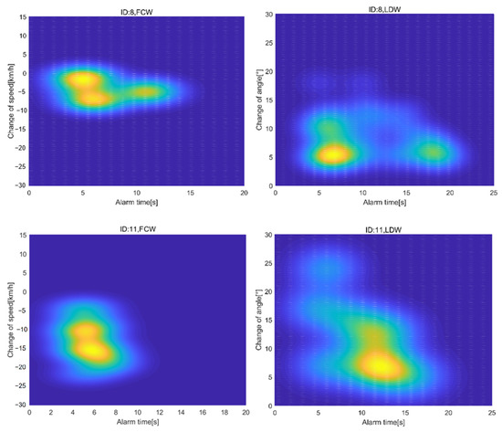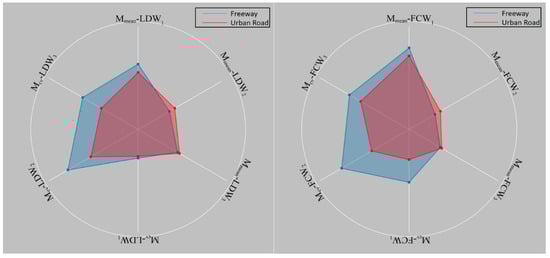 In addition, the difference in the drivers’ reactions to LDW and FCW is more evident in freeways. This shows that the reactions of drivers to the ADAS alarm are closer on urban roads than on freeways. This may be attributed to the fact that the constraints of a complex urban environment and traffic flows lead to increased forced lane departures and forward collision tendencies.