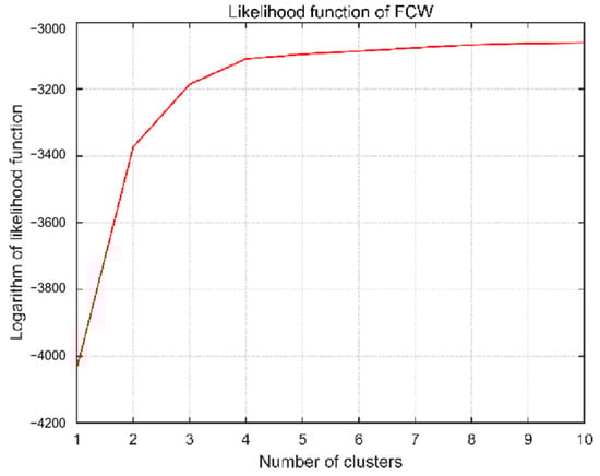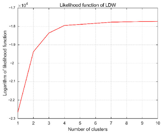 The feature vector x corresponding to LDW and FCW is considered to be the classification index and input to the GMM classifier. The authors determine the number of clusters by observing the value of the likelihood function. On the one hand, the authors want the likelihood function to be as large as possible to preserve the distribution characteristics of the data. On the other hand, the authors hope that the number of clusters may be small enough to achieve better practicability. The variation of likelihood function values under different cluster numbers is shown in Figure 6 and Figure 7.