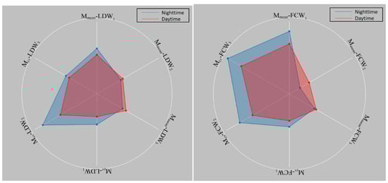 In actual driving, another important driving-environment change is the time of day. There are significant differences in traffic flow characteristics and the visibility between daytime and nighttime. The authors set 6:00 to 18:00 as daytime and 18:00 to 6:00 the next day as nighttime. Figure 14 illustrates the characteristics of the drivers’ reactions during daytime and nighttime. Bus drivers behave more positively to LDW and FDW at night, particularly to FCW. This may be caused by the drivers’ high mental workload at night [47].