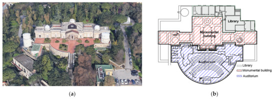 The whole complex (Figure 1a) is located on the top of the Miradoris hill in the city of Naples, and it comprises three separate structures as shown in Figure 1b: the monumental historical building built in 1819 and thoroughly analyzed by De Angelis et al. [19]; the auditorium built in 1982, although the equipment of the internal room dates back to 1990; and the library built in 1990.