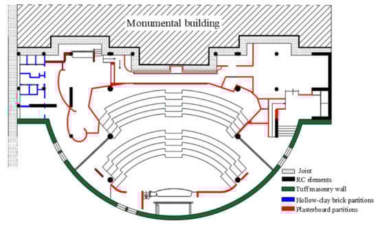 The bearing structure of the building is composed of reinforced concrete (RC) mixed frame-walls and the tuff masonry boundary wall. Inside the building, there are both hollow clay brick (8 cm thick) and plasterboard partitions, as shown in Figure 2. The detected geometrical characteristics are also needed for defining reliable numerical models of the building, aimed at simulating its energy performance. The net conditioned building area is equal to 857 m2. The “surface-to-volume ratio” (S/V) is equal to 0.65 m−1, and thus its shape factor indicates high heat gain/loss.
