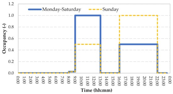 In all three cases, it is also necessary to take into account a layer of plasterboard (2.0 cm, λ = −0.21 W/m K) at the floor intrados under the false ceiling (90 cm) in which the channels and air handling units are located. Indeed, presently, the building has an all-air system for the needs of heating, cooling, and ventilation. These are fueled during the heating season by means of the hot thermal-vector fluid produced by gas boilers and by means of cold water produced by an electric heat pump during the summer. During the activation days, the building is heated to 20 °C and cooled to 26 °C with a relative humidity of 50%. The air-conditioning system is turned on half an hour before the building is occupied and switched off when the building is empty. It hosts educational activities for students or shows for tourists. The occupancy schedule for the days from Monday to Saturday and for Sunday is shown in Figure 3. A maximum of 200 people is considered.