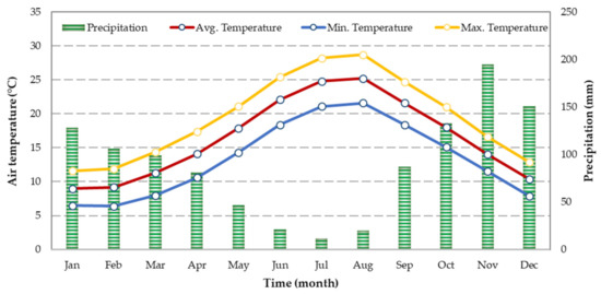 The city of Naples is inside Italian Climatic Zone “C”, characterized by 1316 heating degree days (baseline 20 °C), with the duration of the heating period being established from 15 November to 31 March, according to Italian law. The city is located in the southern part of the Italian peninsula (lat. N 40°50′, long. E 14°18′), with a typical Mediterranean climate characterized by warm summers and winters that are not cold. The city is classified Csa according to the Köppen–Geiger standard [21]. Figure 4 shows the maximum, minimum, and average monthly values of air temperature [22], as well as the average precipitation. The average value of the annual temperature is 16.5 °C, with almost 1080 mm of rain. The month characterized by the highest rainfall is November, while July is the most arid. The monthly average humidity varies from 70% (July and August) to 77% (November, December, January).