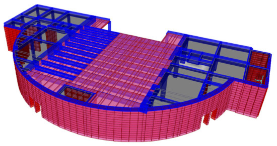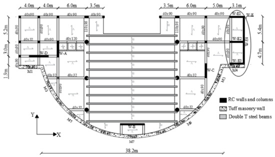 The case study presents a hemicycle shape, and it has a reinforced concrete mixed frame-walls structure (Figure 5). The frames of the lateral wings of the building are characterized by deep beams (cross dimensions = 0.40 × 0.90 m2), flat beams (section dimensions = 0.40 × 0.32 m2), and square columns (0.40 × 0.4 m2); the floors are made of cast-in-place RC and hollow clay bricks as lightening for a total height of 32 cm.