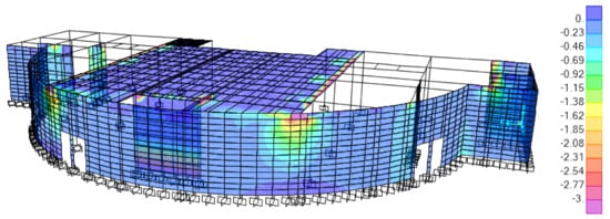 A linear static analysis for gravity loads at the ultimate limit state (ULS) and a linear dynamic analysis with response spectrum for the seismic assessment of the life-safety limit state (SLV) were developed by the numerical model. The choice of the type of analysis for the seismic assessment depends on the characteristics of the building, which is irregular in plan and lacks ductile elements, but also on the low level of knowledge of the construction details. As a first step, the case study was analyzed for gravity loads, considering the building’s self-weight, and the live loads. In Figure 7, the vertical compressive stresses in the boundary wall are reported, giving a maximum value of 0.23 MPa, which is lower than the strength (0.35 MPa).