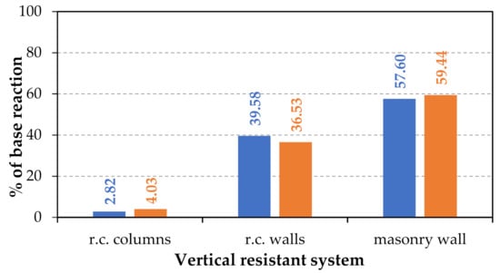 Moreover, since the building has only one story, and the vertical resistant elements are not ductile due to poor construction details, the structure was considered to be non-dissipative, adopting a structural factor q of 1.5. In Figure 8, the percentage of the base reaction of RC walls and the masonry wall evaluated by numerical analysis are reported, evidencing the important role of the boundary ancient wall.