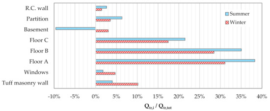 Table 5 shows the calculated stationary and dynamic parameters that give information on the energy quality of the building envelope. Clear double-glazed windows were considered, with an average thermal transmittance of 2.80 W/(m2 K).