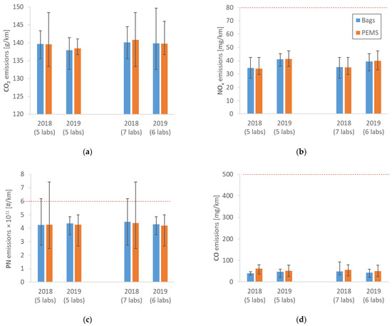 The CO2 emissions (Figure 1a) were around 140 g/km with a variability of approximately ±3 g/km up to ±7 g/km, with the bag results typically on the lower variability range (the exception was 2019, with 6 labs). The PEMS had a low variability (±2 g/km) only in 2019 within 5 labs. No limit is shown in the figure because the EU monitoring CO2 approach is fundamentally different from the not-to-exceed approach for pollutants. The topic will be analyzed in the Section 4.