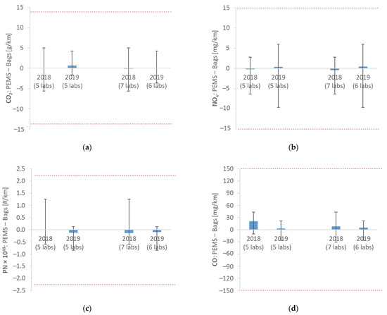 The high variability of the emission levels may mask any bias between PEMS and bags. For this reason, the differences of the two methods for each test and pollutant were calculated. The average differences are plotted in Figure 2.