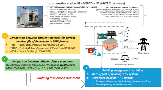 Figure 1 summarizes the methodological approach adopted in this paper. The starting point was the definition of the weather file (EPW) for Benevento that would be representative of the current conditions. Benevento (south Italy, lat. 41°7′55″, long. 14°46′40″) has a typical Mediterranean climate, with warm to hot, dry summers and mild to cool, wet winters. It is inside the “Csa” class, according to Koppen classification [23]. According to UNI 10349:2016 [24] and National Decree n°412: 1993 [25], the heating degree days (HDDs), baseline 20 °C, are 1316 °C day, the winter design temperature is −2.0 °C, and the summer one is 32 °C.