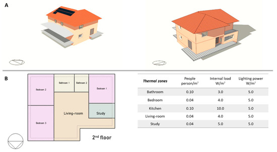 The case study is a single-family house described in TABULA web-tool [36] for a middle climatic zone. This choice does not influence the results of the study, since the building is very representative of the Italian building stock of the 1980s and it will be undergoing refurbishment interventions according to the threshold value for the climatic zone of Benevento. The net heated area is 198 m2 with a gross volume of 729 m2 and the surface to volume ration is 0.65 m−1. The whole window-to-wall ratio is 8.2% with a glazed surface of 8.7 m2 on the north side and 9.7 m2 on the east side. The structure is composed of three levels: a semi-basement, used as a garage, and two floors above the ground. The building envelope is characterized by a pitched roof with brick-concrete slabs, brick wall, and double-glazed windows with air gap and wood frame. The thermal transmittance of the wall (Uw) is 0.74 W/m2 K, for the roof (Ur) is 1.20 W/m2 K, and for the slab on the ground is 1.04 W/m2 K (Us); the solar factor (SF) and the glass thermal transmittance (Ug) of the windows are, respectively, 0.75 and 2.08 W/m2 K. The insulation level is very low if it is compared with the current Italian requirements [47] for Italian Climatic Zone “C”. Indeed, in case of refurbishment works, the thermal transmittance must be lower than 0.36 W/m2 K for the walls, 0.38 W/m2 K for the basement, 0.32 W/m2 K for the floors, and 2.00 W/m2 K for the windows. Regarding the plants, a gas boiler with atmospheric burner and chimney lower than 10 m, placed in an unheated room, is used for heating service. It produces hot water at 80 °C for radiators placed in every room. The domestic hot water is produced by the same boiler coupled with a storage tank with a medium level of insulation. The total efficiency of the gas boiler was set equal to 0.9. For the summer air conditioning, it was assumed that in the main room, a split-system was installed with a nominal cooling capacity of 3.25 kW and a nominal performance coefficient equal to 3.0. The lighting system consists of fluorescent lamps with a specific rated power of 5.0 W/m2. In the heating season, a set point temperature of 20 °C was set with an operating period (10 h per day) from 15 November to 30 March, as defined in [24,25]. In the cooling season, from 1 June to 30 September, the set-point temperature is 26 °C (10 h per day). For the photovoltaic system, the use of monocrystalline silicon modules was considered, with an area of 1.63 m2, peak power of 300 W, and module efficiency of 18.4%. The technical data comply with a SUNPOWER model (SPR-300-WHT-I) [48]. The model rendering is shown in Figure 2A and the description of the main data for the thermal zone is reported in Figure 2B, which also shows the distribution for the 2nd floor. The infiltration and ventilation rate was fixed globally to 0.5 ACH. The simulation of this configuration represents the state of fact of the building (base case).