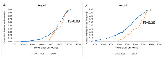 Another interesting comparison regards the methodologies based on the original and modified Sandia method (TMY and TMY2). For instance, with TMY, August 2019 was chosen as the typical month. As can be seen in Figure 3A, in this year, the short-term CDF had FS equal to 0.08 compared to the long-term CDF for GHI. In many points, there was a strong proximity of the cumulative distributions. For the same month of the same year, as seen in Figure 3B, the short-term CDF of the DNI denoted a greater discrepancy than the long-term CDF with FS equaling 0.20. This comparison shows the differences between the two methods and thus it can be concluded that the typical months chosen for TMY2 had a greater agreement between the chosen DNI and the one of the baseline multiyear record. This aspect is not trivial since the direct normal radiation has high weight when a renewable energy system, such as a photovoltaic system, must be considered. Moreover, it also influences the solar gains contributed in the building energy balance and mainly in the summer period, it could affect the evaluation of overheating inside the building and the cooling consumptions.