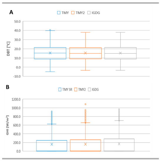 The box-plots of Figure 4A for TMY2 and IGDG are comparable, with the same maximum and minimum values, respectively, 38 °C and −3.5 °C, and an almost coincident average value. This is very significant considering the strong differences in the methodologies. The values relating to the first and third quartiles are instead comparable for all three distributions and, on average, equal to 21.4 °C and 8.9 °C, respectively. Regarding the horizontal global radiation (Figure 4B), the distribution of IGDG is the one characterized by the highest values. The average value of IGDG is equal to 168.2 W/m2 while those relating to TMY2 and TMY are equal to 162.1 W/m2 and 158.6 W/m2, respectively. Instead, the maximum value observed with IGDG, without considering the aberrant values, is equal to 705 W/m2 while these are 655 W/m2 and 626 W/m2, respectively, for TMY2 and TMY. Therefore, the box-plots on GHI also show greater comparability between the distributions of TMY2 and IGDG. It seems that TMY is built with one or more typical summer months with lower solar radiation levels.