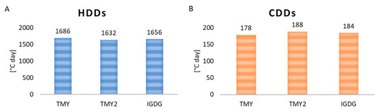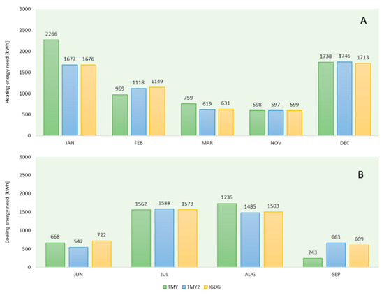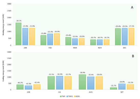 Figure 5A shows the calculated heating degree days and in Figure 5B, the CDDs are presented. In both cases, the values are comparable with a maximum difference of 3.2% for HDDs and 5.1% for CDDs between TMY and TMY2.