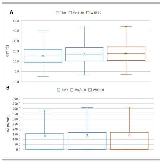 Figure 6A shows the comparison between the distribution of DBT in case of TMY and for the projections obtained starting from TMY with the WeatherShift tool. It was interesting to observe that the variation in the average annual values depended both on the effects of climate change but also on the uncertainties of the projections that different models considered for the same time horizon. In the cases of W4.5-50 and W8.5-50, the average temperatures were about +12% and +15% compared to the average value of TMY, respectively. Even the extreme values of the distribution underwent an evolution. The minimum value went from −4.9 °C to −3.4 °C with the “strong mitigation” scenario (RCP 4.5) and to −2.8 °C with the “business as usual” scenario (RCP 8.5). The maximum values without considering the aberrant ones, were comparable, and near 44 °C in both cases. Similar conclusions can be arrived at for DNI distribution, shown in Figure 6B.